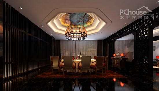 编辑点评:设计师用隐喻的手法将具有中国特色元素的窗格、灯笼、水墨画等融入整个设计中,营造出一个柔和而又高雅的氛围。四方形的窗格吊顶,与圆形餐桌表达天圆地方的构思。