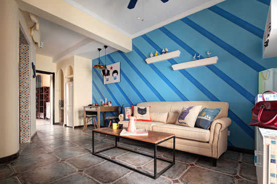 小编点评:室内空间富有层次感,由宽至窄的走道设计使得客厅通向其他空间的方向充满神秘的引导感。白色与淡杏色的交错配上富有现代感的蓝条背景墙,彩色波点墙框和带有复古风味的瓷砖,整个空间因其融合散发出难以描述的情迷小调。