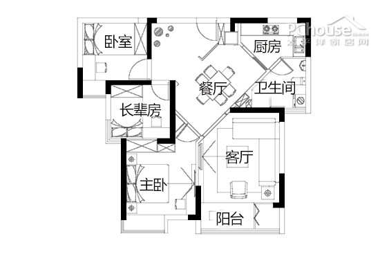 2:餐厅的设计巧妙地利用了户型中45度的斜角布置,让公共空间的动线规划更灵活流畅。