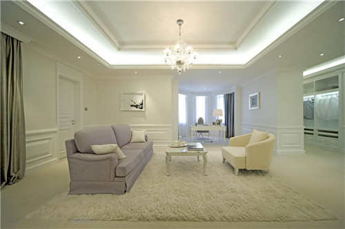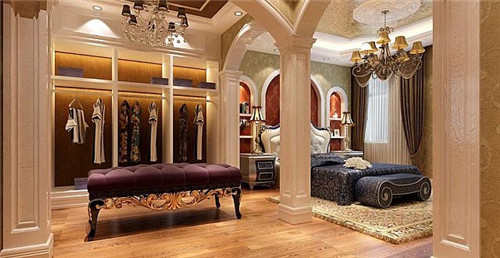 衣帽间与卧室相通,中间用宫廷风格的石柱隔开。两盏吊顶增添了房间里额华丽感。