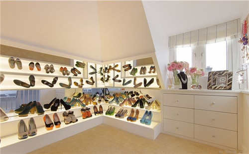 将不规则阁楼打造成个性的衣帽间,鞋子的摆放让房间充满艺术感。