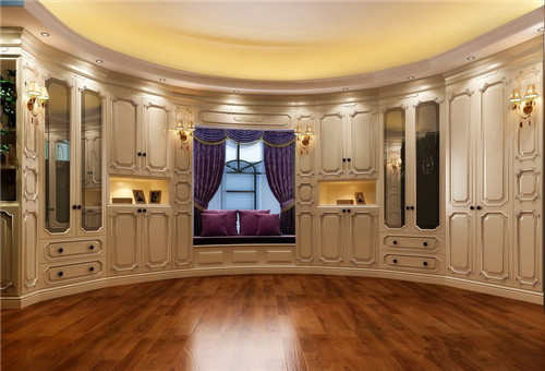进门就给人整洁大气的感受,衣柜上的橱灯和紫色的窗帘都丰富了衣帽间的格调。欧式的大气衣橱让你仿若在宫廷。