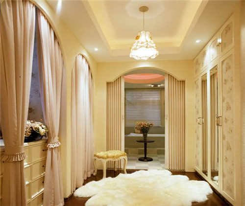 浪漫的吊顶和落地窗帘让这间衣帽间有了公主房的感觉,衣橱和隔断门的阻挡设计,让人推开就别有洞天。