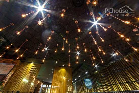 编辑点评:散座区的设计充满各种隐喻性元素。下垂的古铜网在灯光的照射下散发出金光,营造了后现代工业风范的“珠帘”。复古的钨丝灯错落有致的低挂着,低调而随性。