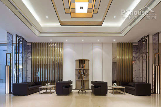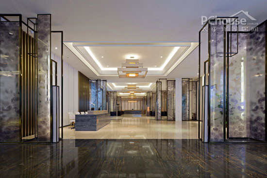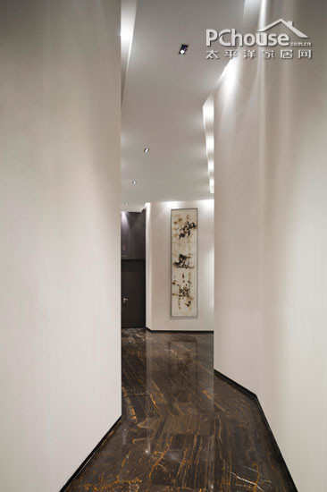编辑点评:曲折的过道,白色的墙面,白色的天花板,干净整洁,黑棕色为底的地板上黄色的不规则纹路像洒落砖板路的金粉,古朴又尊贵。迂回转折之间,视线的尽头是一幅充满古典气息的水墨挂画,颇有穿梭回古代回廊的感觉。中式的古朴迂回与西式的简约明朗相得益彰。