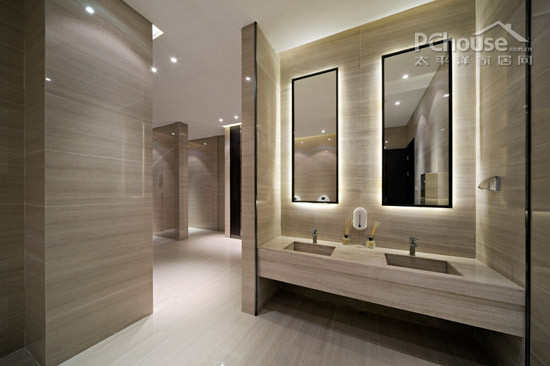 编辑点评:香槟色带有流沙的质感的大理石铺满墙面,地面铺满的大理石颜色比其略浅,泛着干净的白色,和白色天花板交相呼应。硬朗简单的墙面将空间隔开,镜子用黑色的边框勾勒,给人干脆利落的视觉感受,时尚与后现代感用最简约的方式展现得淋漓精致。
