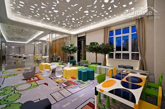编辑点评:一反隔玻璃而望的那个空间的简单色调,这个空间一眼望去五彩缤纷,拼图形状的绿色、藏青色、黄色、银灰色还有黑色的立体桌面,印有卡通图案的地毯,白色天花板像精致的剪纸,灯光透过不规则碎片口撒下,点亮了这个五彩缤纷,却不纷杂的儿童乐园。在这里,孩子们可以任思绪纷飞,尽情释放天性。