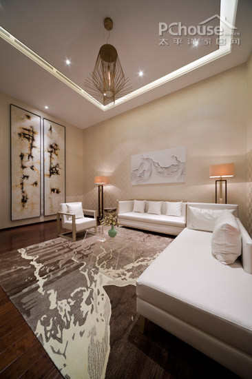 编辑点评:金属材质的吊灯,像除去外衣的灯笼,安静地呆在白色的天花板下,香槟色的墙面挂着中式充满诗意的挂画,白色沙发线条简单流畅,半围踏着棕色的地毯,如海上浪花的花纹雀跃其上,又仿若沙漠里生命的活泉,充满生的希望,生活的喜悦。而褪去外衣的金属灯笼吊灯,就算没有华丽的外衣,依然能够绽放光芒,不忘生活的本质。