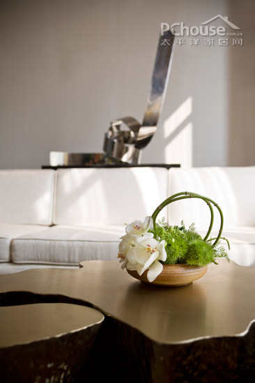 编辑点评:不规则的光滑的黑棕色桌子,线条随意流畅。木桩般的厚实感,稳重古朴,又像融化的巨大巧克力,透着丝滑浓醇的质感。充满设计感的小花篮里面,绿色和白色巧妙结合的花草,清新自然。设计师不忘随意和清新的设计初衷,巧妙地在细微的角落,让人眼前一亮,不禁吸一口清新的氧气,沁人心脾。