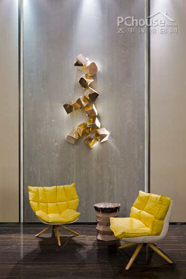 编辑点评:银灰色的墙面中间,用打磨光滑的不规则立体几何金块拼凑出的图案,像站起来的马,又像站起来的小萌宠,让人充满遐想。两张明黄色的沙发椅安静站立,其间是一张充满设计感的柱形小桌。简约亲切,让两个促膝长谈的人放松身心,