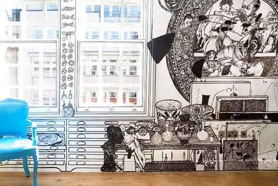 英国艺术家Charlotte Man的墙面画作可以说是马克笔的逆袭。画作内容一般为家具、窗、管道等室内设施,只用黑色的马克笔却拥有细腻的细节表现,1:1的绘画比例让画作显得十分真实,无论观赏者站在什么角度,都能被这独特的墙面绘画所吸引。