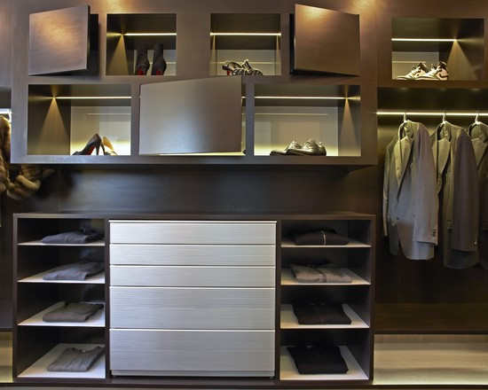 小编的话:深棕色的色感像是代表着男人的深沉与稳重。间歇拉开的壁柜让衣帽间有了奇妙的感觉,精致的女鞋在柜上就像是高贵的艺术品装点着这间阳性十足的衣帽间。