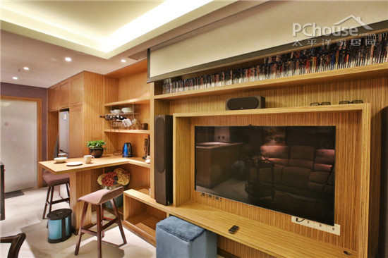 编辑点评:客厅主要以舒适为主,肖毅峰将具有按摩功能的沙发放置在客厅中。喜爱电影的他又将这里定义为影音空间,放置上120cm宽的投影幕布,搭上广角投影仪,一个VIP影音室就这样华丽诞生。热爱电影的他将客厅的墙面设置成碟片储存架,一处文艺气息浓厚的客厅就这样闪亮登场。