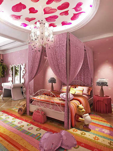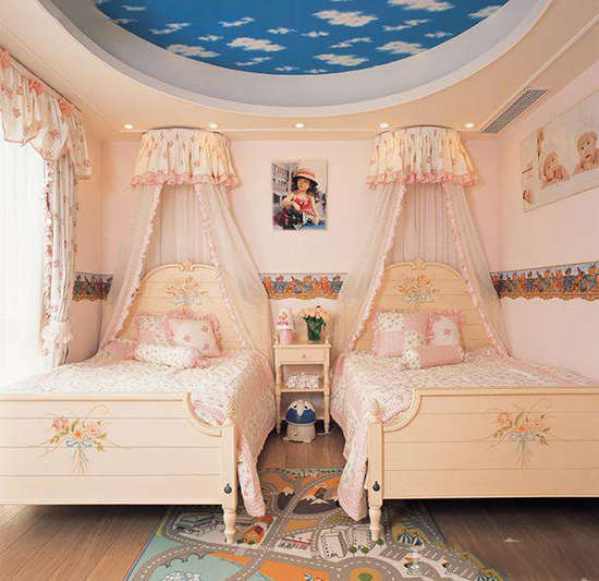 小编的话:看得出来这间儿童房的小主人是一对双胞胎小姐妹,那么蕾丝碎花自然成为了软装设计的主要元素。蓝天白云吊顶拉伸了房间的视觉高度,下方的地毯图案是一座小城镇的卡通地图,顿时给房间增添了家家酒一般的童真乐趣。