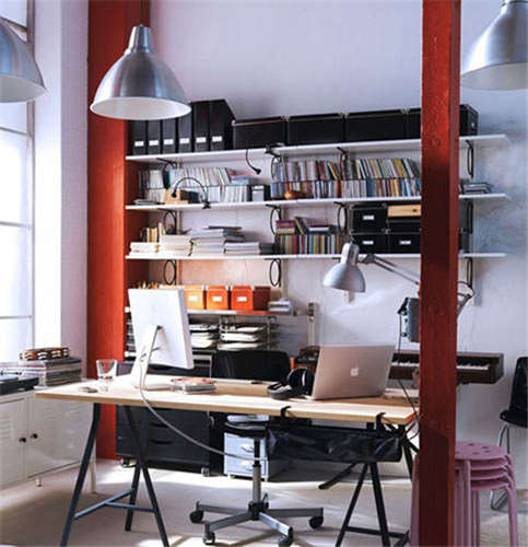 这间书房里书桌后方放置了一个收纳柜,这个收纳柜不仅可以用来放书还能起到收纳小玩意儿的作用哦。简易的木制和铁艺结合的书桌符合大点的孩子们使用。