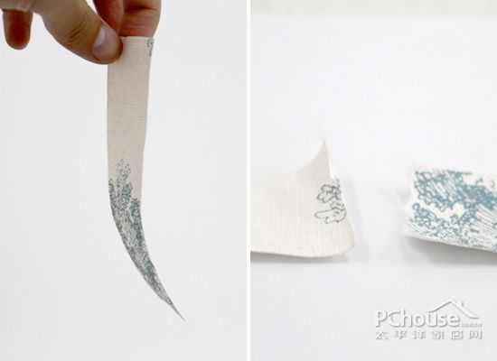 而以浸透后的玛堡壁纸进行观察,壁纸侧面无出现明显的波浪状受潮变形,只产生了轻微的受潮软化,且边缘依旧整齐。对受潮测试过的壁纸进行用力撕扯,无出现轻易断裂的现象。撕扯过后的壁纸,无明显两头起翘的现象,仅在一头发生了轻微的弯曲。