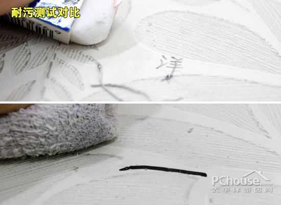 玛堡悠活系列壁纸,以铅笔测试,壁纸上的铅笔字迹以橡皮擦除后,壁纸表面可保持干净完整。以油性笔作为测试,评测员以湿抹布仔细擦除刚刚画过的油性笔迹,结果发现,油性笔迹不仅无法淡化,而且仅有浅浅的墨迹残留在湿抹布上面。说明此款壁纸不耐油性笔笔迹。