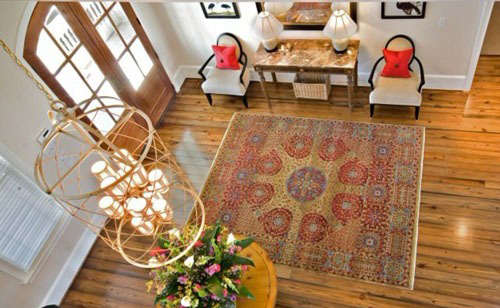 案例小点评:通过地毯就能表现出主人乐观向上的个性,地毯写着“冷静之后继续前进”颇具励志感;湖蓝色地毯与黑白地砖形成鲜明对比,瞬间成为焦点,而湖蓝色与枚红色大门,搭配愉悦的宜人效果,客人走在这块欢快的地毯上面能感觉到主人的好客。在尺寸上,这块地毯相对大于门框宽度,长度延伸至房间内侧。