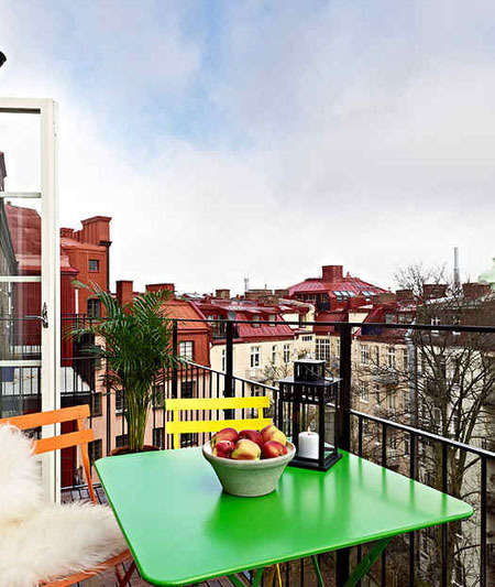 小编点评:五颜六色的桌椅给黑色铁艺的阳台也增添了不少活泼的感觉。阳台不仅仅是绿色的天堂,点缀一些其他的色调会让空间的层次感更加的丰富。在视觉上也更加的享受。