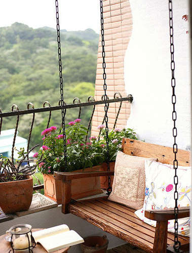小编点评:小小的阳台上放上这样一个舒适惬意的小秋千椅也是挺不错的。横向刚好能坐下两个人,如果阳台面积不够的话,单人的也行。实际上在阳台上放上一个藤编的摇椅也很好玩。