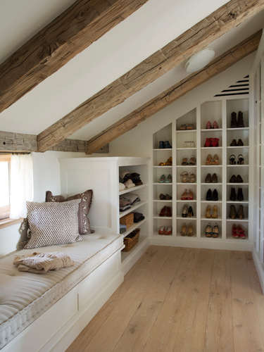 小编的话:空间宽敞的一面用来衣物收纳,而低矮的一边则作为鞋柜收纳。功能设计与阁楼的形状吻合。