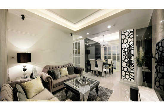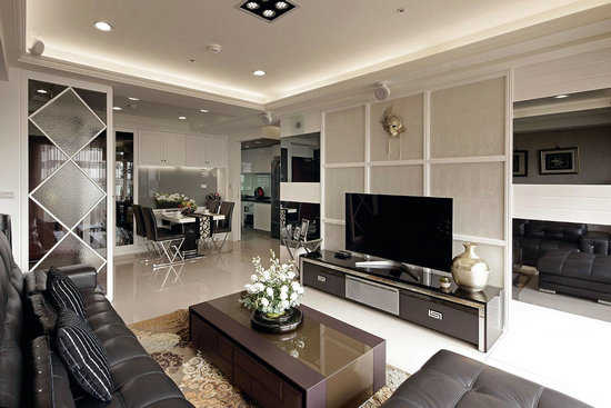 编辑点评:使用家具及水晶吊灯,布置出内敛优雅的居家氛围。拆除原本书房的隔间墙,以灰玻作为空间界定,利用材质的穿透特性,串联空间达到放大效果。