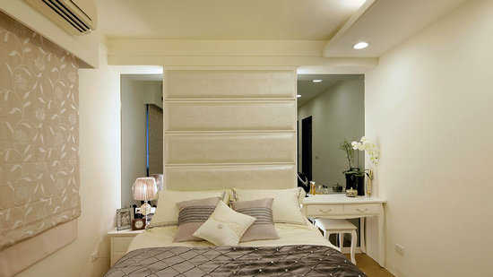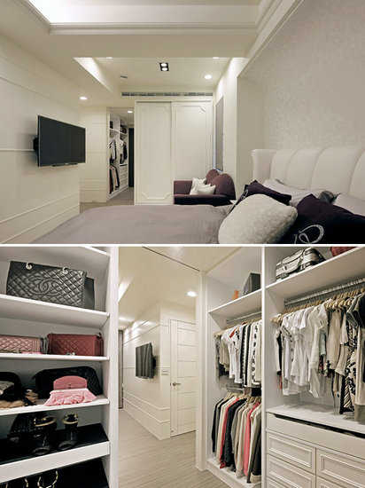 编辑点评:打通两间卧房,除了实现女主人心中的梦想更衣间,也化解原本卫浴门正对床铺的尴尬。在梳妆台增设推拉镜,保留空间采光,也兼顾更衣室的隐私问题。
