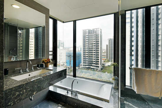 编辑点评:位于角窗的主卧浴室,配置降板浴缸,在家泡澡成为最大享受。
