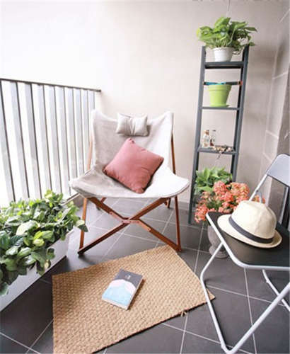 工作间外的小阳台,就这样简单的放一个躺椅也很惬意,阳光无限好,放一些绿植更有生活激情。搭配软绵靠垫、小绿植,看累了,躺下来休息休息,看看植物,赏心又悦目。