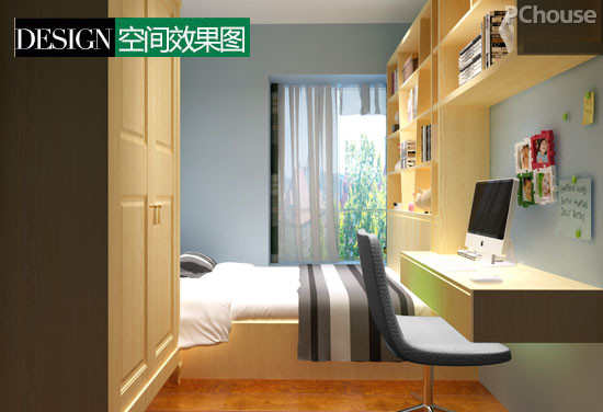 4. 把书房改成儿童房,以榻榻米床改变空间有限的缺点,把进门改到房间中间,两边分别设置衣柜与写字台,满足了储物与学习的功能;