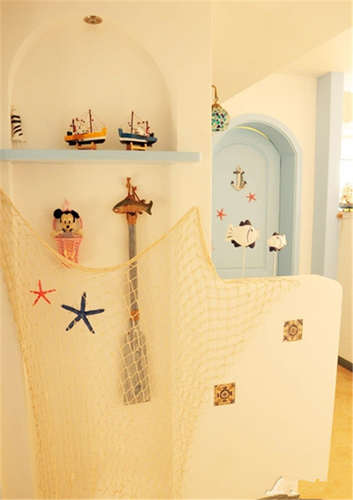进门的玄关处,用了装饰网和一些小海星做装饰。零星点点的局部小布置也能让这个地方显得地中海味浓郁又不拥挤凌乱。