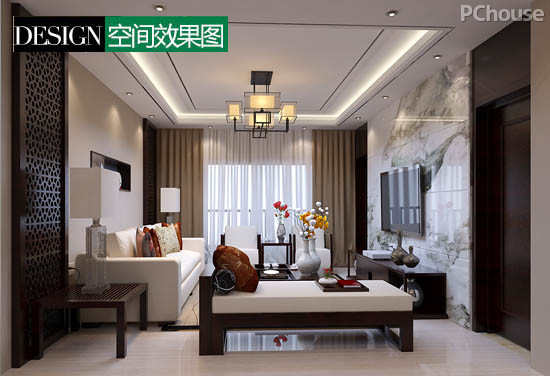设计解读:在沙发背景的设计上,利用简单的乳胶漆颜色,搭配客厅两边的雕花格,形成一个简单而大气的沙发背景。
