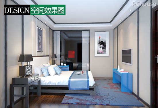 设计解读:卧室里也是以中式风格为主,偶尔以蓝色置物架、绣花抱枕等,混搭出不一样的风味,活跃了空间沉静的气息。