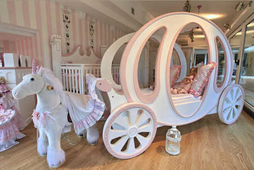 小编的话:看到这间儿童房设计,绝对能吸引一大批女孩的眼球,不仅有舒适的床铺,还在房间中设有一辆童话中才有的马车用来给宝贝在平日里玩耍用,整个房间中以淡淡的粉色系来打造,让整个空间看上去都粉嫩嫩的,对于家中是女宝的家庭来说,这样的一间儿童房绝对是梦境变为现实的感觉。