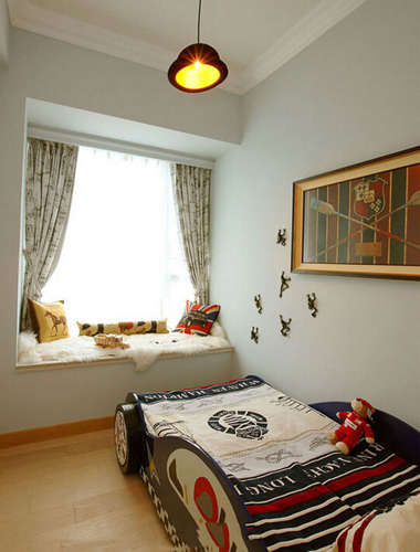 小编的话:空间不大的儿童房中,可以简单的摆放上一张造型独特赋有童趣的儿童床,再作一个飘窗的设计,让整个房间看上去显得空间宽敞舒适,顶部简约的吊灯也让这间屋子显得温馨不少。