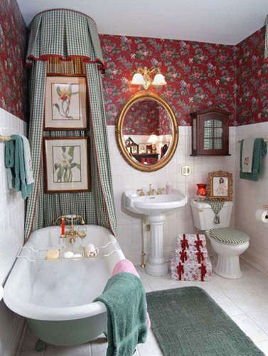 小编的话:白色瓷砖与红色碎花墙纸拼接而成的墙面让这间卫浴空间中显出一种小复古的感觉,椭圆形的金边镜面配上精致的小壁灯让这间卫生间显得温馨感十足。