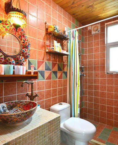 小编的话:橘色的瓷砖与木质天花板打造出了这样一间具有异域风格的卫生间,淋浴区的窗户可以让这间卫生间一直保持通风状态,避免异味困扰。