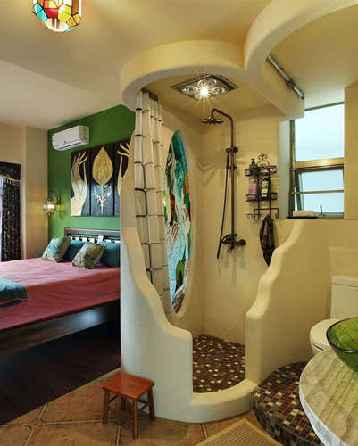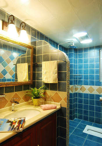 小编的话:这款具有强烈地中海风格的卫生间以开放式的格局来呈现,在卧室一旁的区域内,以圆拱形顶部来划分出每个功能区,追求异域风格的业主一定会喜欢上这种个性装修的卫浴空间的。