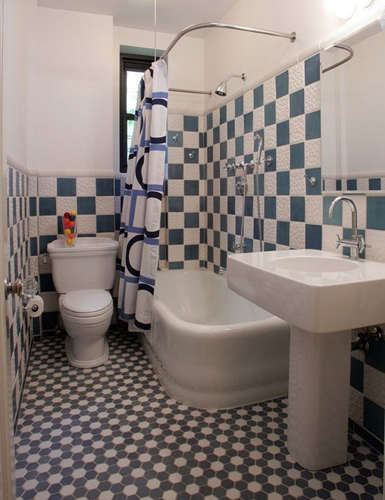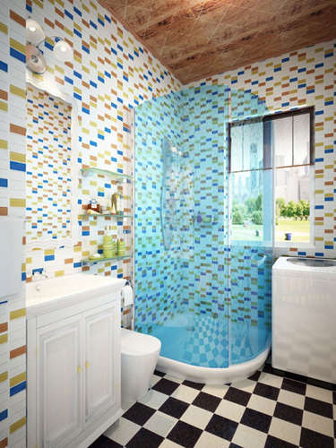 小编的话:具有强烈视觉对比的卫生间内,从黑白相间的地面到马赛克墙面,再加上清凉的蓝色系玻璃淋浴房在其中,这样的一间卫生间让人在视觉上就能感觉大空间中所带来的时尚感。