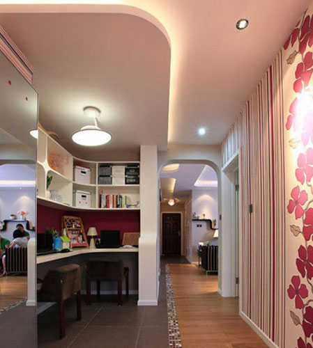 小编的话:利用宽敞的过道空间,以大理石与木质地板划区分出一个阅读空间,顶部则以圆角吊顶界定出整个书房空间,一个开放式书房就如此简单的呈现出来了。书房旁边的整面全身镜既实用,又能让这一过道空间在视觉上产生扩容的效果。