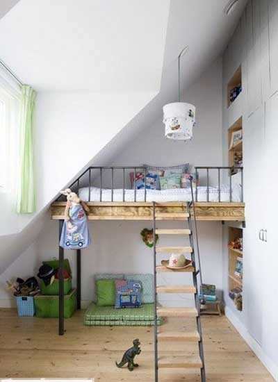 小编的话:小小的阁楼空间给孩子当做玩耍和休息区也是非常不错的主意。屋顶和墙面的交接处形成小小的三角形空间,利用起来能很好的节省空间,一个台阶一个床铺就能设计出一个极富趣味的睡觉空间。