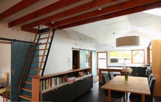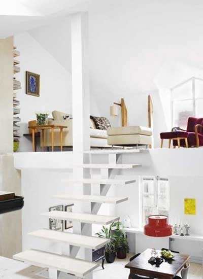 小编的话:空间有限并不代表你不能有一个感觉宽敞开阔的房间。可以考虑在起居室减少一至两堵墙,增加更多呼吸的空间。同时可以利用地台,在阁楼空间中再造一个楼,让卧室位于其上,小木板搭建的楼梯肯定不会让你失望。
