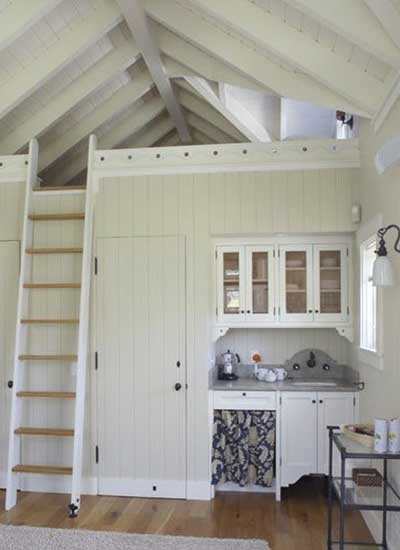 小编的话:阁楼空间最大化。这个小屋在空间利用上非常出色,手扶梯直通阁楼,下方是衣柜、内置壁橱和水槽。水槽嵌在整个墙面内部,上方的空间随着屋顶的伸展而有无限的扩展可能,无论是当成卧室还是休息地都很不错。