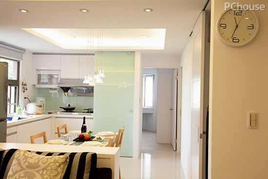 编辑点评:活动的烤漆玻璃门,破解了一进门视线对到炉灶的禁忌,遮挡面向炉灶的视线,兼顾室内空间的通透与延伸。