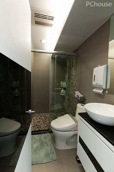 编辑点评:黑白配色洗手台呼应整体设计,灰色质朴中缀以黑白马克砖缤纷空间设计。