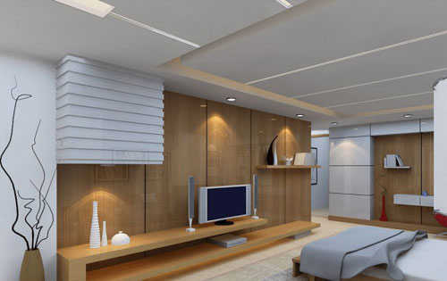 淡雅的卧室装修,主要以灰色与木色呈现,而电视背景墙也只要通过浅色木墙体打造,未设置柜门的镂空型电视柜宽敞大气,为了避免单调,一旁还放了艺术造型的瓷瓶予以点缀,而另一侧则特设了搁架,摆上装饰品。
