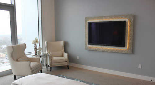 没有电视柜、没有装饰画,这款电视背景墙的打造简单采用带有光源的电视底座,将挂壁式电视机立体突出,简单却不失奢华,符合整体简约但高品质的卧室装潢。