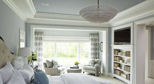 这款电视背景墙中,整个以镶嵌手法打造。电视被安置在了较为高的顶部位置,而下方2层凹型区被用作展示所用,整个卧室电视背景墙小巧但却精致。