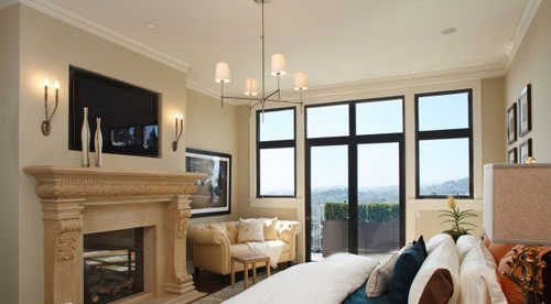 正对着床有个能带来温暖的壁炉,精致的欧式古典造型,是一面不用经过多于修饰的电视背景墙,电视机正好镶嵌在壁炉上方的墙壁之中,2段设以壁灯增添美感。