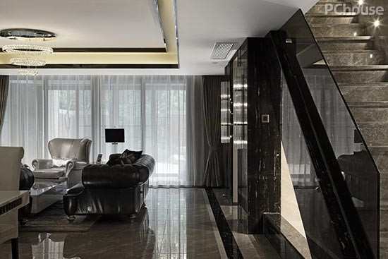 编辑点评:客厅中低矮大气的复古沙发深浅搭配,背后是定制的一对1米高的水晶质地壁灯,在低调的黑色大理石砖的映照下,散发出璀璨光芒。客厅铺设的反光度极高的大理石,落地窗引入的光线顺势延伸,令空间不再压抑,产生挑高层面的视觉差。